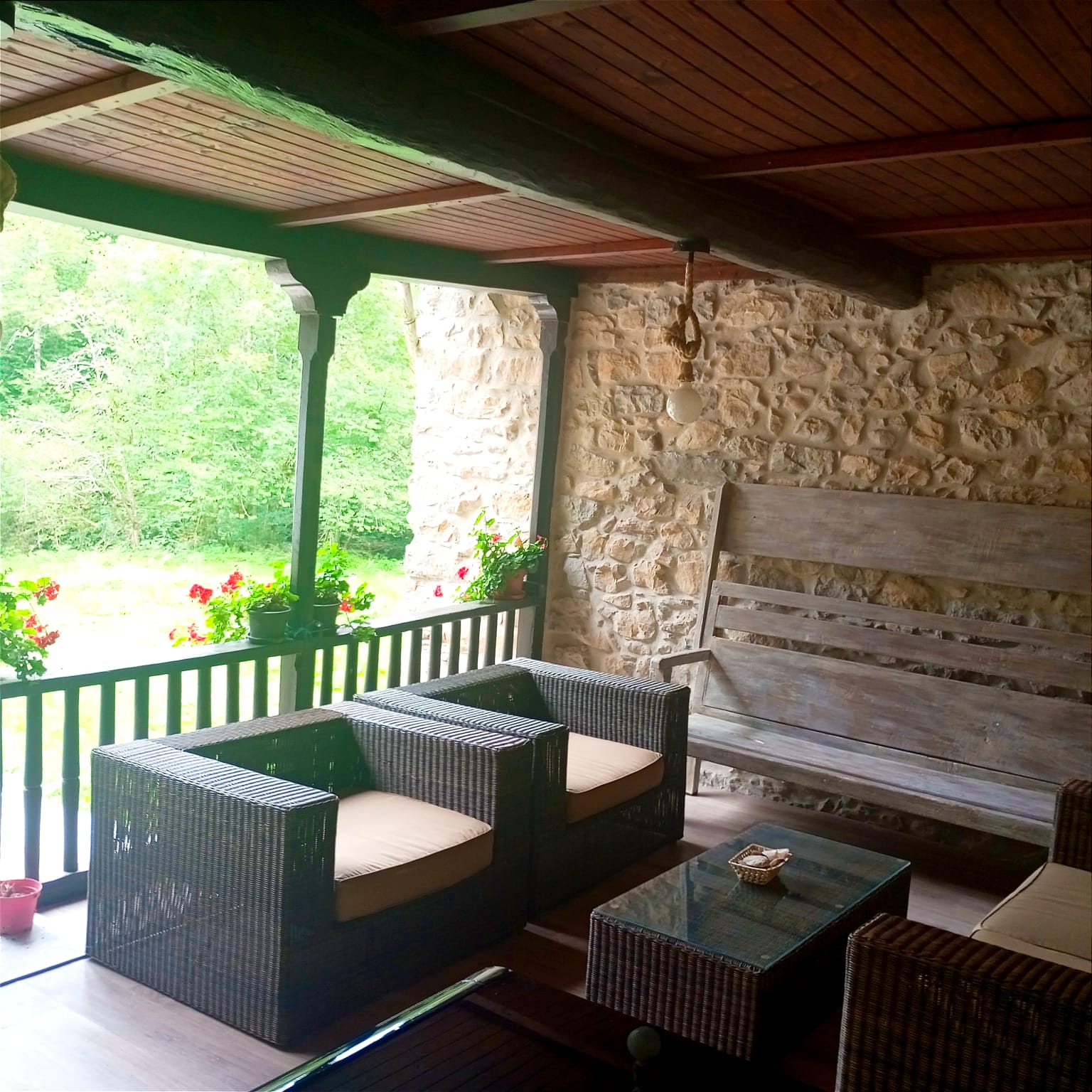 Balcón con vistas al bosque y zona chill-out con sofás.