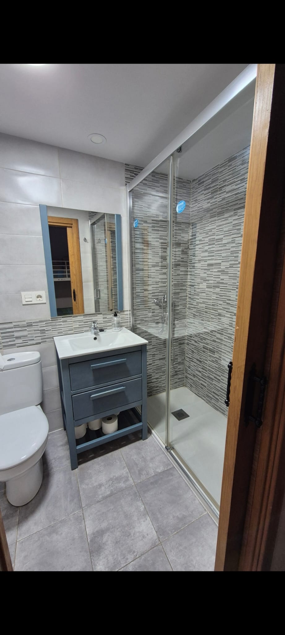 Ducha amplia, lavabo con armario, váter y secador de pelo.